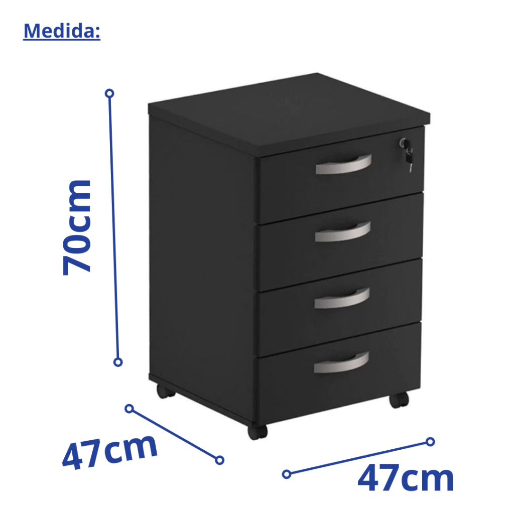 Sistema de fechadura lateral (com travamento simultâneo de todas as gavetas), pés com rodízios, puxadores tipo alça, corrediças metálicas