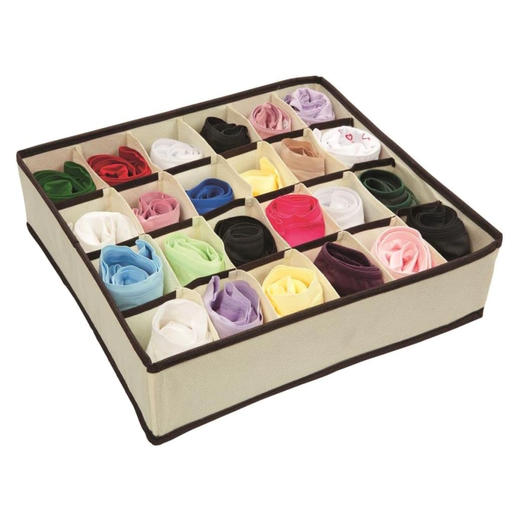 Organizador de peças Íntimas para gaveta com 24 espaços, cor creme com detalhes em marrom.