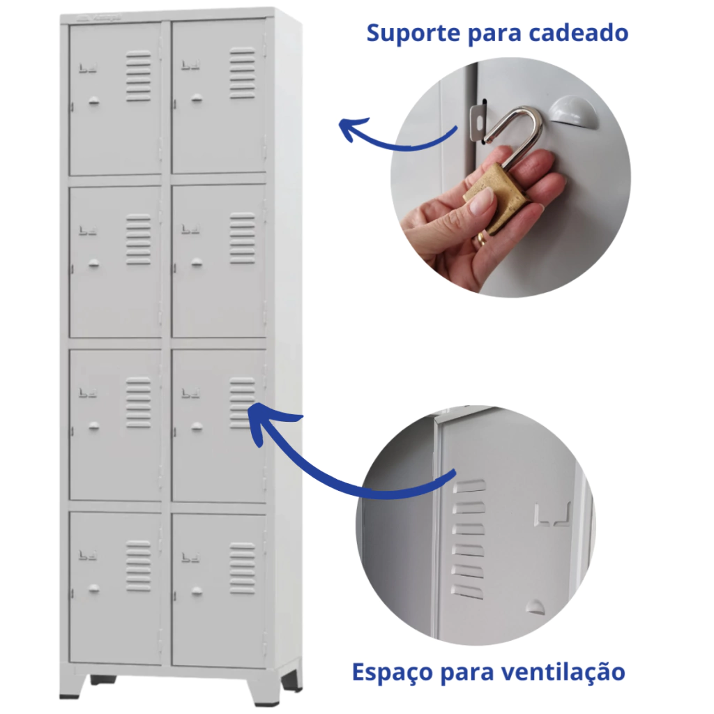 É prático e versátil. Possui portas com pitão para cadeado, além de tratamento especial da superfície e pés com sapatas plásticas protetoras.